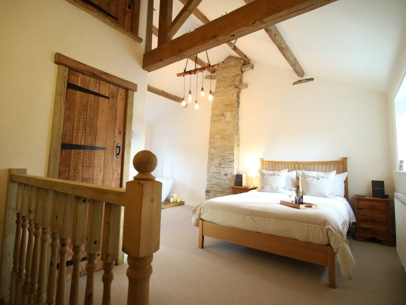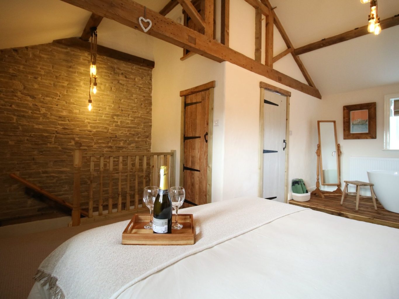 The spacious open plan bedroom with vaulted ceiling, exposed beams and luxurious freestanding bath is the perfect space to unwind and relax after a day exploring.